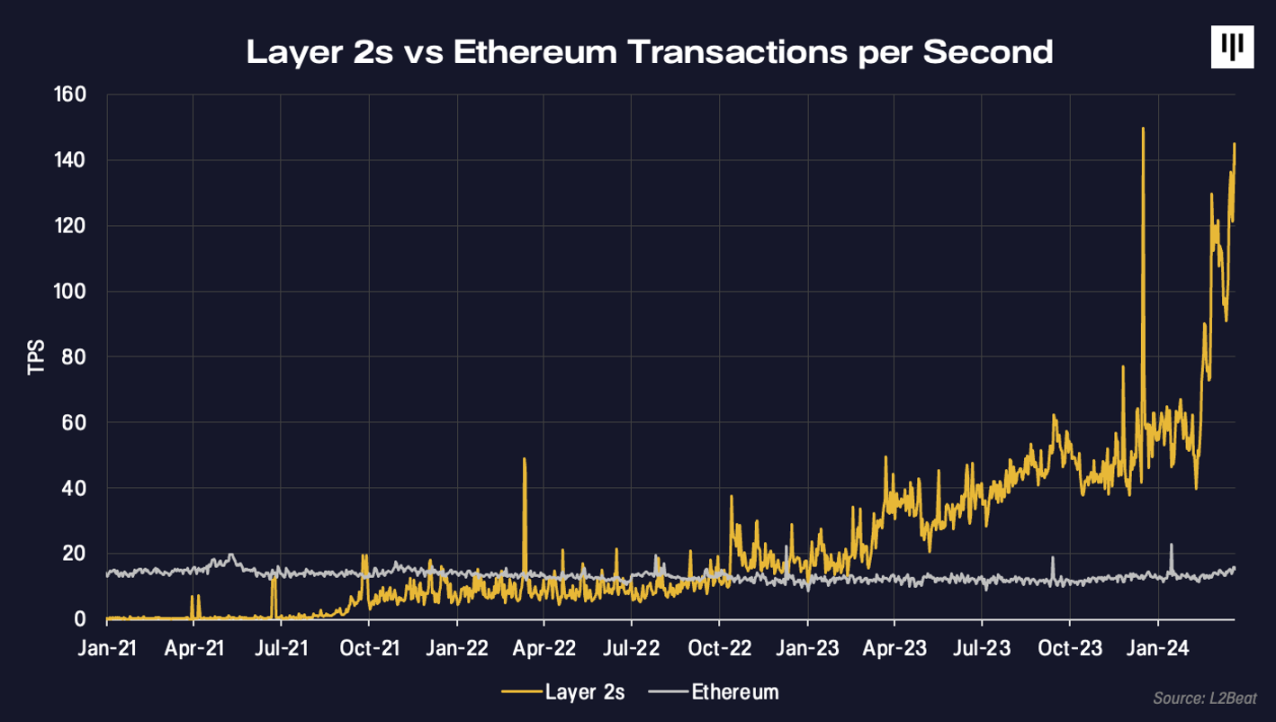 目前,基于以太坊的 L2 的总交易吞吐量超过 140 TPS(每秒交易量),而 L1 只有 14 TPS(见图)。