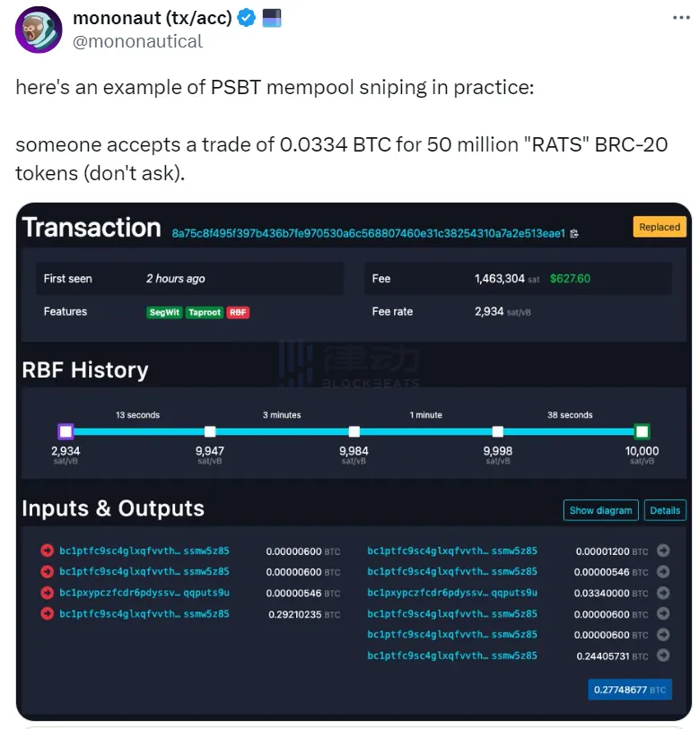 其实 PSBT 导致的 RBF 抢跑和以太坊上拉 Gas 是一样的,区别只是比特币的区块确认时间更长,在以太坊上往往 10 几秒就出下一个块了,大家就很清楚是在「卷」。而比特币上的各种概念大家可能一时间会稍微陌生一些,实际上 RBF 抢跑和以太坊上的 MEV 最终呈现出来的效果还是有点像的。