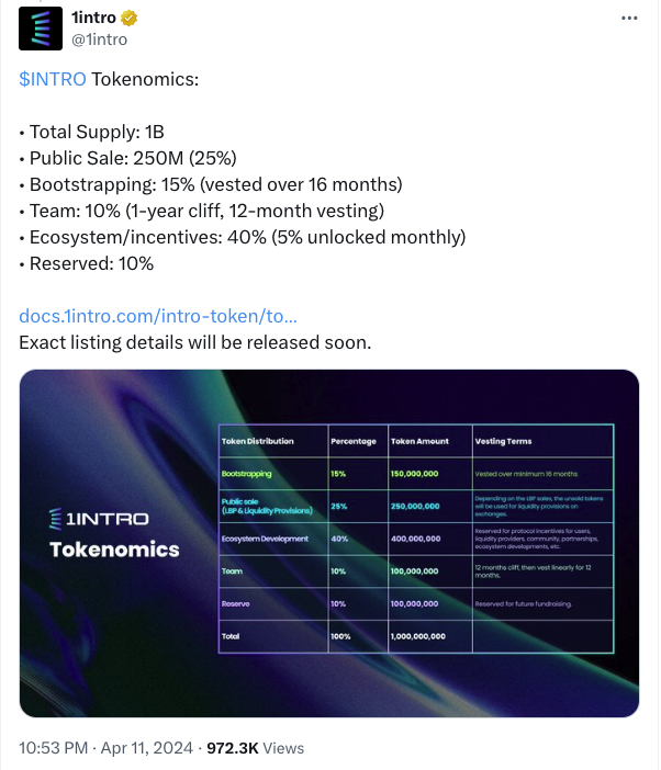 INTRO 总供应量为 10 亿枚,其中 2.5 亿枚参与公开发售,1.5 亿枚用于 Bootstrapping(16 个月内归属),1 亿枚代币分配给项目团队(12 个月线性归属),4 亿枚代币用于项目生态系统或活动奖励(每月解锁 5%),剩余 1 亿枚保留。