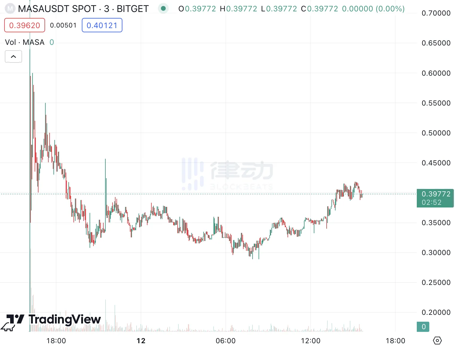 据了解,MASA 于 CoinList 的公募价格为 0.079 USDT,昨日开盘后 MASA 最高触及 7.97 美元,但很快回落至 0.39 美元。