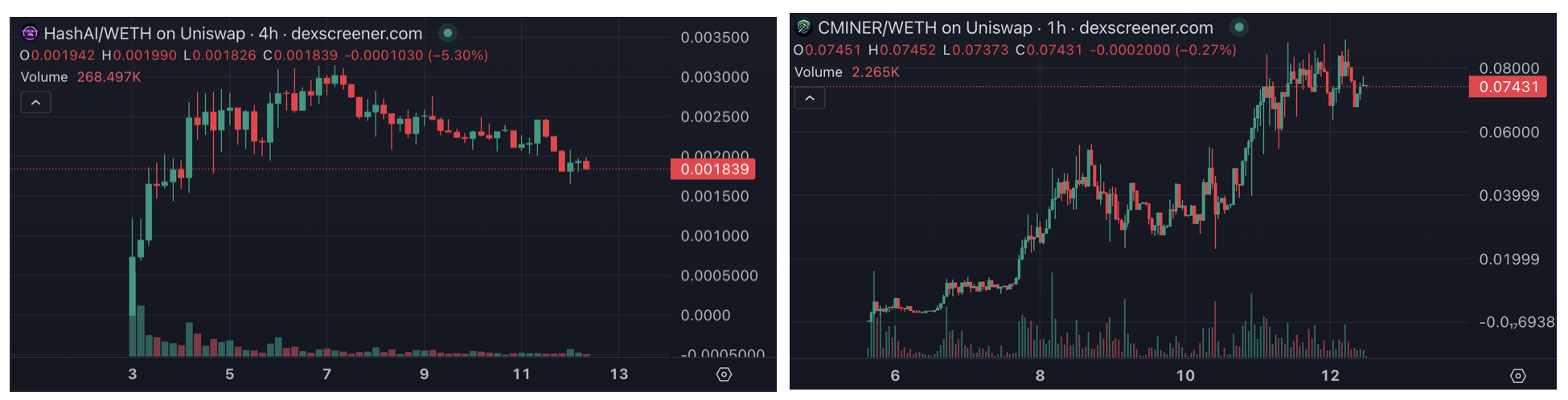 但在社区看来,有同为挖矿项目、市值曾突破 3 亿美元的 HashAI 在前,上线不足一周的 ChainMiner 市值上涨空间就大了许多。之后,许多 Alpha 喊单 KOL 将 CMINER 视作「下一个 HASHAI」宣传,CMINER 持续上涨,截至撰稿时已较上线之初有 40-50 倍的涨幅。