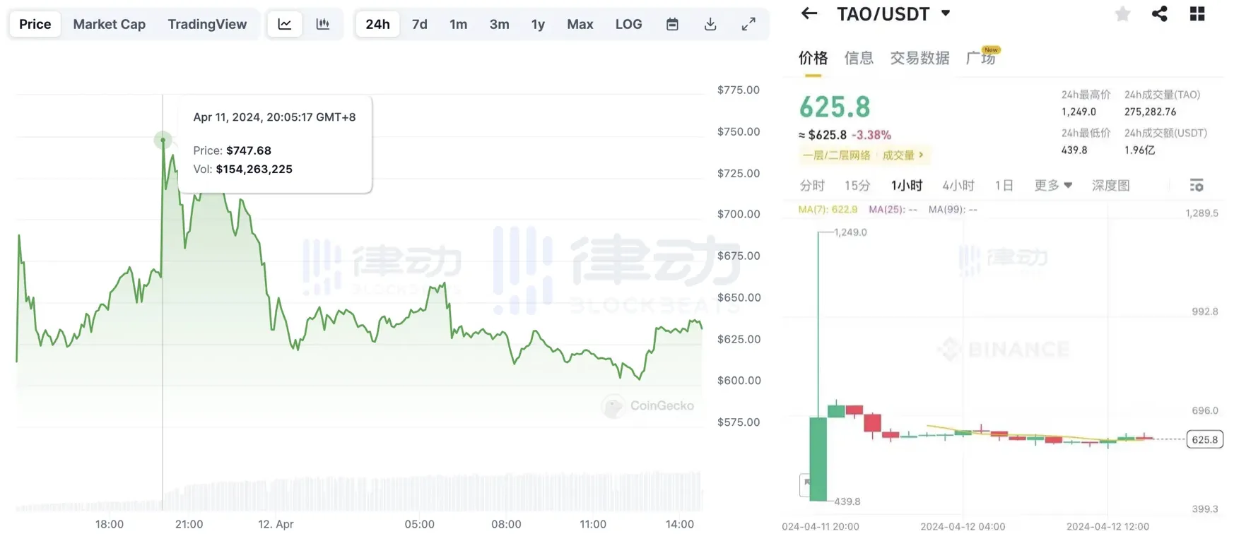 4 月 11 日,Binance 发布上线 Bittensor (TAO) 的公告,受此消息影响,在 600 美元以下徘徊数日的 TAO 1 小时涨近 20%,在当日晚间突破 700 美元,最高到达 747 美元,创历史新高。