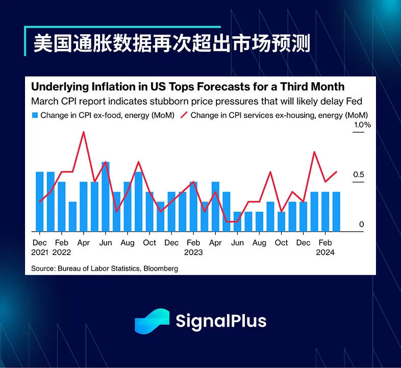 市场面临不友好的通胀数据,特别是周三的 CPI,核心价格朝着不乐见的方向发展,3 月份整体 CPI 和核心 CPI 均环比上涨 0.4%,CPI 年增率从上个月的 3.2% 升至 3.5%,核心 CPI 年增率保持在 3.8%,其中能源增长 1.1%,服务增长 0.5%,租金方面增长 0.4%,超级核心 CPI 环比再度上涨 0.65%。