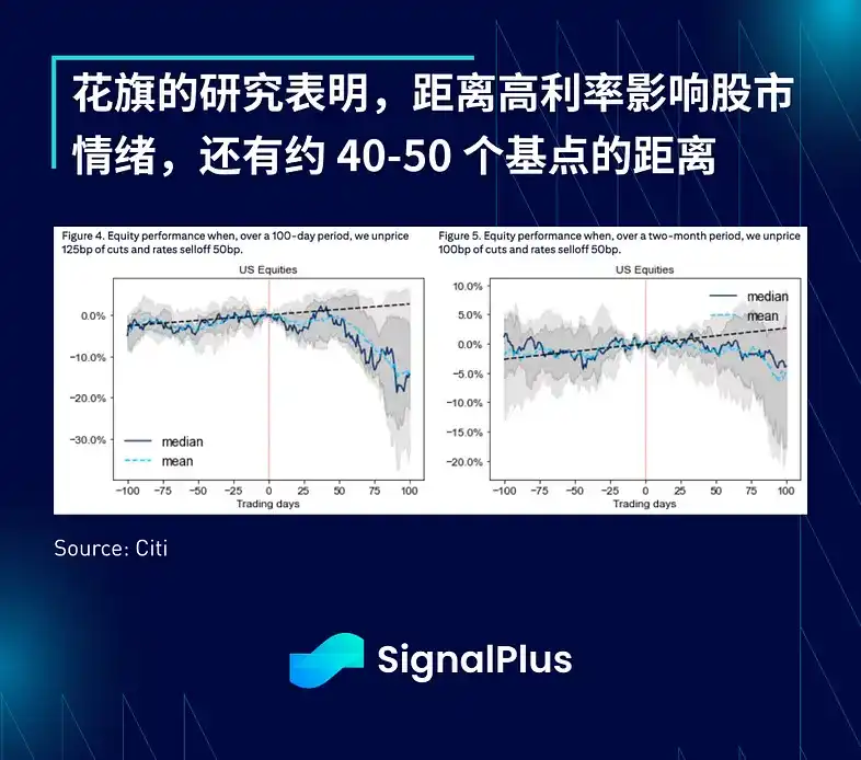 关于利率何时会对股票产生影响这一重要问题,花旗进行了分析,他们研究了先前的「鹰派」情景并得出结论,认为我们距离当前的利率变动对股市产生负面影响还有一段距离(~ 40–50 个基点)。投资者也认为这种情况极不可能发生,他们确信美联储将在强劲的增长和通胀中保持鸽派倾向,因此无法想像他们会完全排除所有隐含的降息,因此,投资者选择继续关注企业获利(即将到来)、经济增长(强劲)以及美联储的友善评论,以支持股市情绪持续走高。从目前的情况看来,只要当前的经济轨迹保持不变,实际降息只不过是额外的利多。