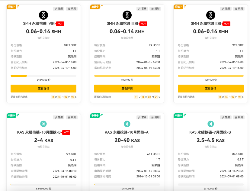 最后,不得不提平台上最新推出的云挖矿产品——KAS 永续挖矿期货和 SMH 永续挖矿。简单来说,用户不需要自己购买矿机、寻找便宜电价,也不需要自己进行配置等各种后勤工作,即可参与小矿币挖矿。