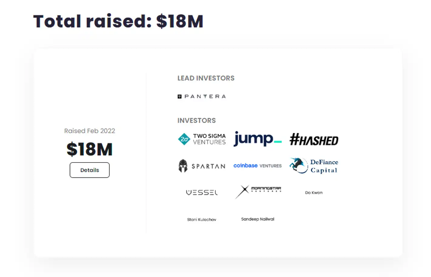2022 年 2 月 8 日融资 1800 万美元,此轮融资由 Pantera Capital 领投。