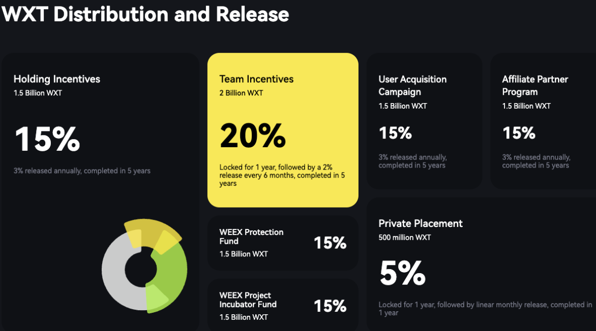 2)WXT 生态基金持有 15 亿 WXT(15%)。用于支持项目孵化,助力初创项目成长和生态发展,推动 Web3 技术创新。