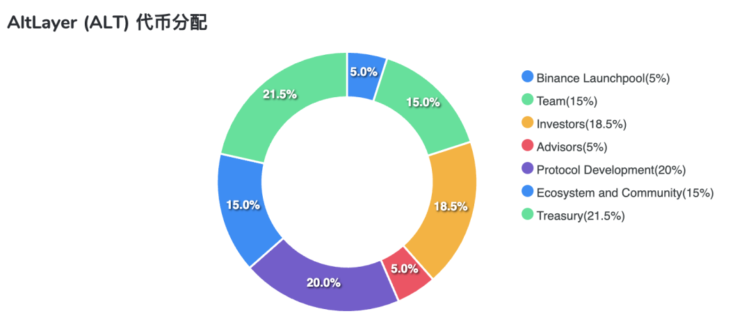 ALT 的总供应量为 10,000,000,000 ALT;币安 Launchpool 发行量为 500,000,000 ALT,占总供应量的 5%;团队分配量为 1,500,000,000 ALT,占总供应量的 15%;投资者分配量为 1,850,000,000 ALT,占总供应量的 18.5%;顾问分配量为 500,000,000 ALT,占总供应量的 5%;协议开发分配量为 2,000,000,000 ALT,占总供应量的 20%;生态系统和社区分配量为 1,500,000,000 ALT,占总供应量的 15%;财库分配量为 2,150,000,000 ALT,占总供应量的 21.5%。