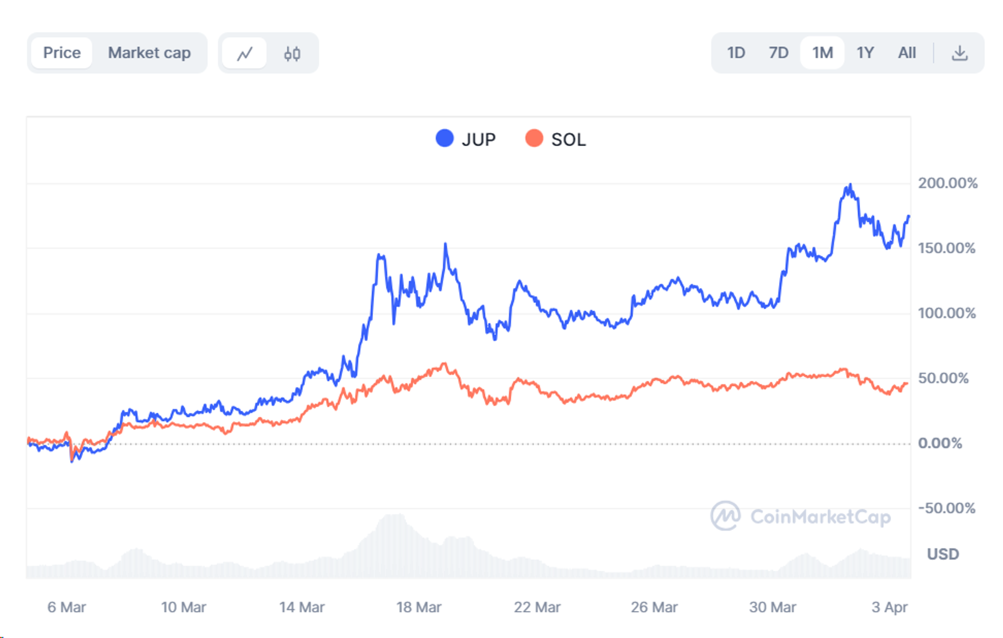 在这一阶段的代币表现上看,Jupiter 和 Solana 的价格增长基本同步,在最近一个月内,JUP 的上涨幅度超过 SOL,这也说明了 JUP 将成为 SOL 的杠杆性标的。