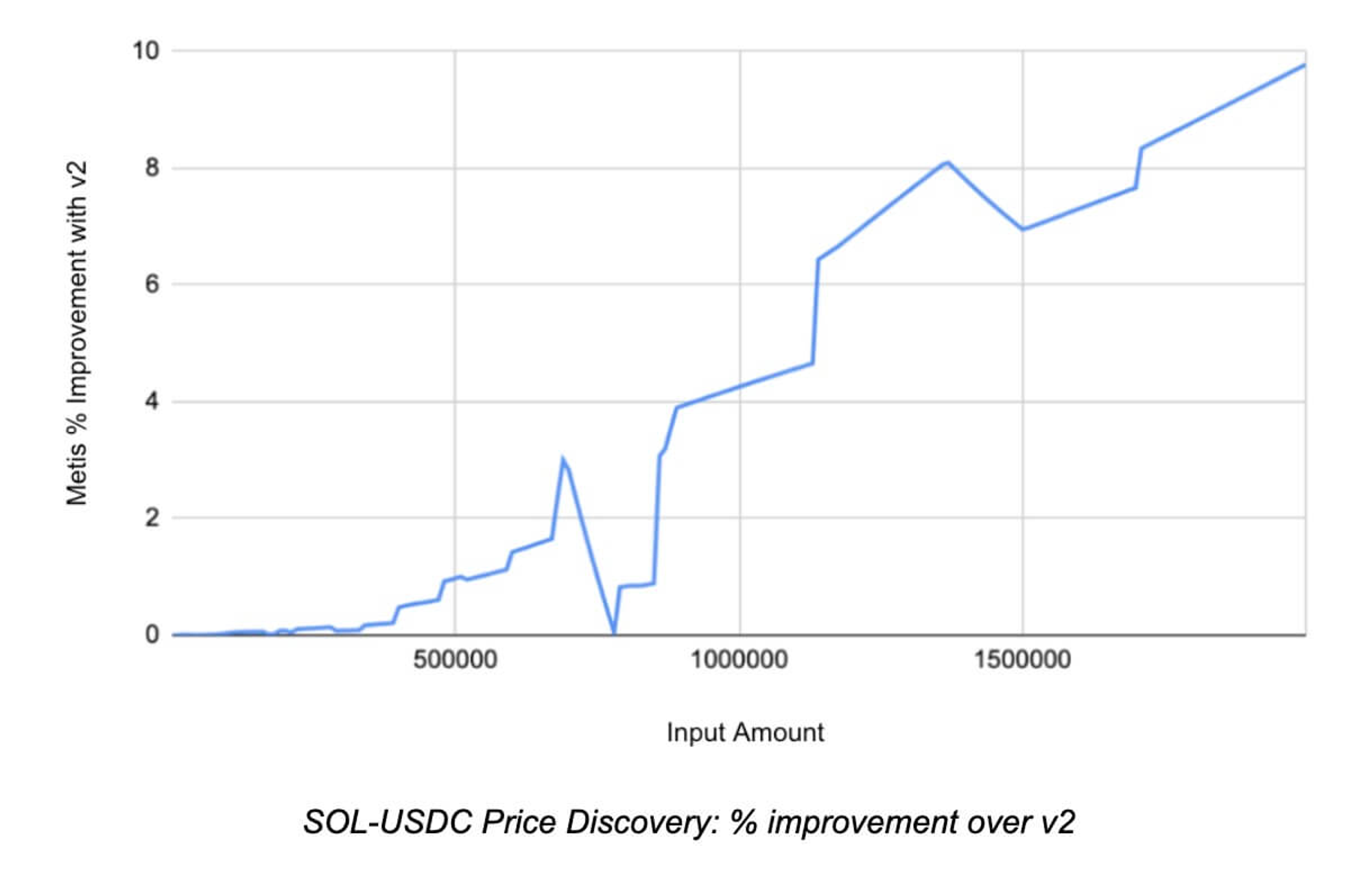 Jupiter 目前使用名为 Metis 的路由算法,旨在在 Solana 的快速区块时间内提供最优价格路由。相比于 V1 和 V2,Metis 提供了更为灵活和复杂的交易路径,从而实现更好的价格发现。此外,Metis 算法提升了可以支持的 DEX 的数量,并在大额交易中表现出更强的报价能力,根据 Jupiter 官方数据,Metis 的报价能力平均而言比 V2 引擎高出 5.22%,且改善程度随交易额度的增加而快速增加。