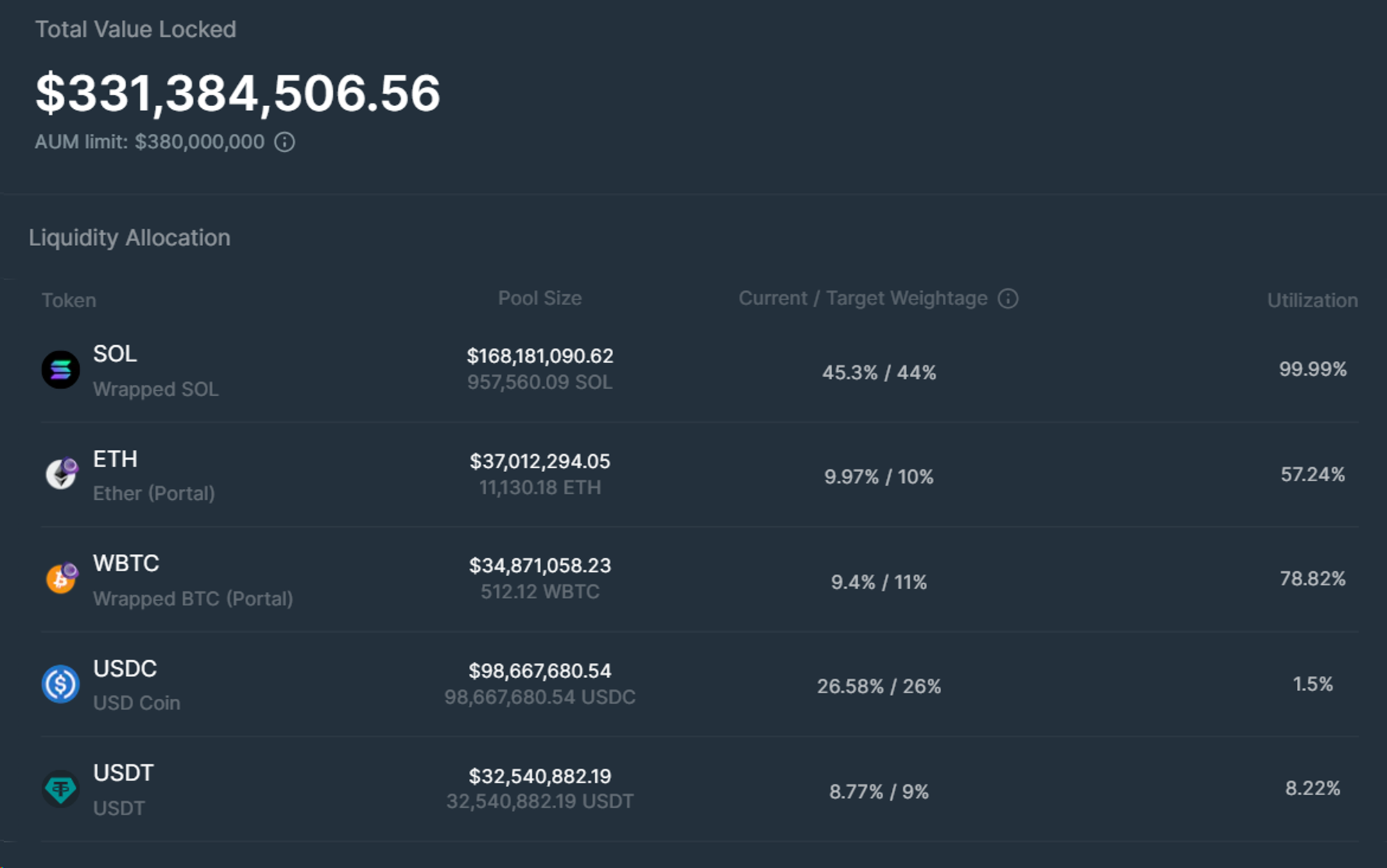 目前,JLP 池支持五种资产:SOL、ETH、WBTC、USDC、USDT。JLP 池将获得交易所收益的 70%,这些收益包括开仓和平仓的交易费用,以及借款的利息费用(相关收费标准如下表所示)。目前 JLP 池的 TVL 为 $331,384,506.56,相应资产比重如下图所示。