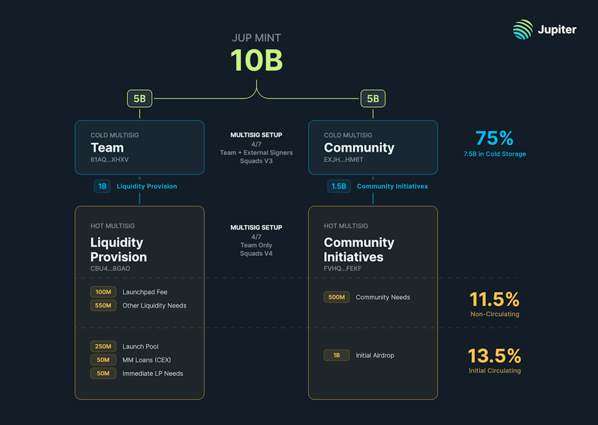 其中,在归属团队的 50% 代币中,20% 将会被分配给团队成员,但在两年后才会开始分配,20% 进入战略储备,保存在 4/7 Team Cold Multisig 钱包中,这些代币将被锁定至少一年,在任何流动性事件前必须至少提前六个月向社区发出通知,剩余 10% 的 JUP 代币将用作流动性供应并保存在 Team Hot Multisig 钱包中。