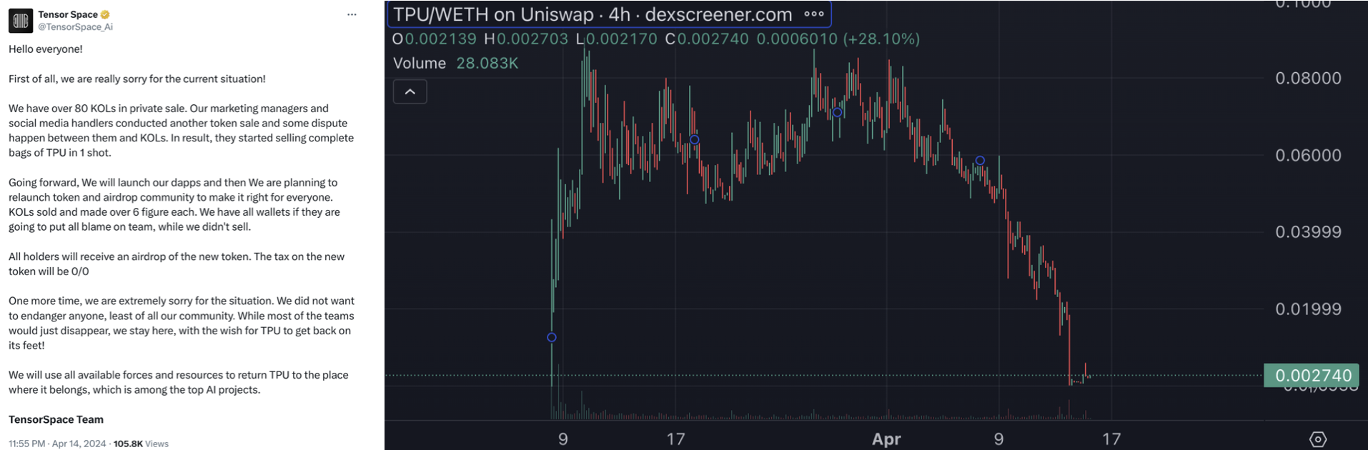 这条推文写道:「有超过 80 位 KOL 参与了我们的代币私募。我们的市场经理和社交媒体管理员近期进行了另一次代币销售,但在这个过程中,他们和 KOL 之间发生了一些纠纷。结果,这些 KOL 开始一次性抛售大量的 TPU 代币。"