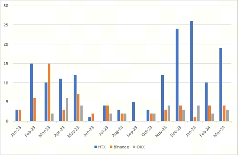 根据知名 KOL John Squire 的统计,在过去的 15 个月里,HTX、Binance、OKX 上线了不同数量的资产。自 2023 年 11 月起,HTX 加速了资产的上线步伐。