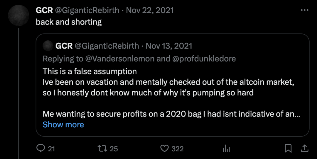 GCR 在 2021 年 10 月忙碌了一番后,在 11 月放慢了脚步——因为山寨币市场达到了极度兴奋的状态,他选择了休假。11 月 22 日,他在网上发文说「回来了,开始做空」。两天后,他明确地宣布市场已经接近周期的高点:「我很有信心我们正处于周期的尾声,而且周期仍然存在……如果你已经赚到了钱,现在就确保你的收益安全。」大约两周前,也就是 11 月 10 日,BTC 的价格已经达到了周期内的最高点,为 69,000 美元。对于即将进入 2022 年的交易者,他给出了一条建议: