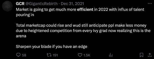 GCR 本质上是一个逆向操作者——他在 2021 年的推文中经常提到一个「生命之树」,这是利用市场的关键。在许多不同交易者对 GCR 的秘密进行大量猜测之后,他最终暗示这个「生命之树」实际上只是愿意与共识观点对赌的一种意愿。他是乔治·索罗斯的忠实拥趸,并经常提及索罗斯的谈话要点,讨论反身性以及逆向思维的理念。