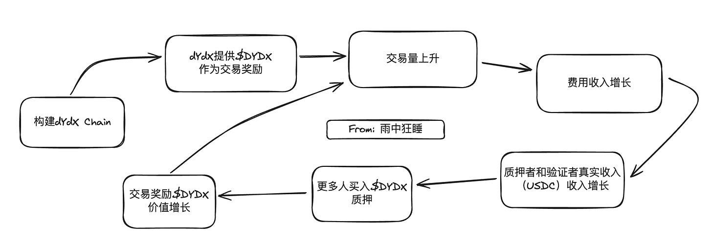 这个飞轮的发动机是 $DYDX 的价格,只有 $DYDX 的价格上涨,才会有足够的用户逐利在 dYdX 上进行交易,产生更多的手续费收入。