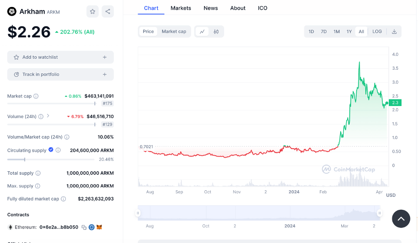截至目前,ARKM 代币的价格是 $2.24,市值为 $459,060,903,排名为 #175,交易量 / 市值比率为 10.06%,这个比率较高,可能表明在市场上有较大的交易活跃度,或者在价格发现过程中存在较大的波动。如果 ARKM 代币的全部供应量都以当前价格计算,则市值将达到约 $2,243,699,429。