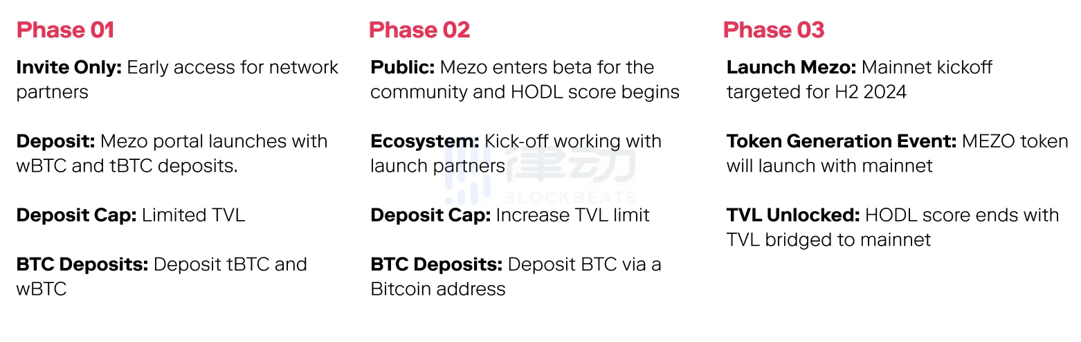 第二阶段的 Mezo 开放社区测试,HODL 评分开始,并启动与项目伙伴的合作。将提高第一阶段的 TVL 限额,并支持更多 BTC 地址类型参与存款。