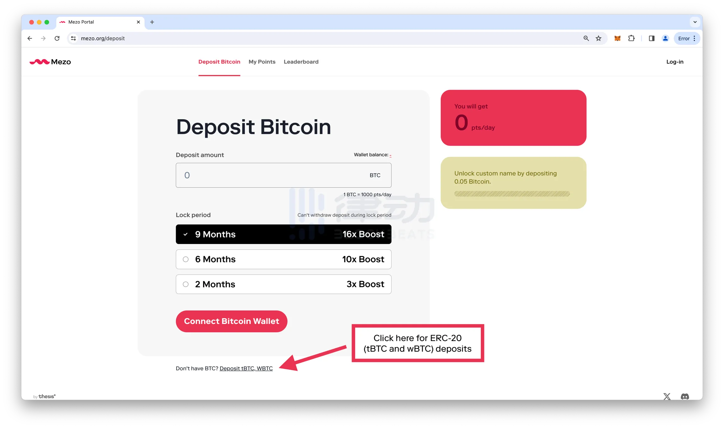 Mezo 上充值的货币是原生 BTC,如果用户想存入 tBTC 和 wBTC,可以在输入邀请码之后点击网站底部的链接。