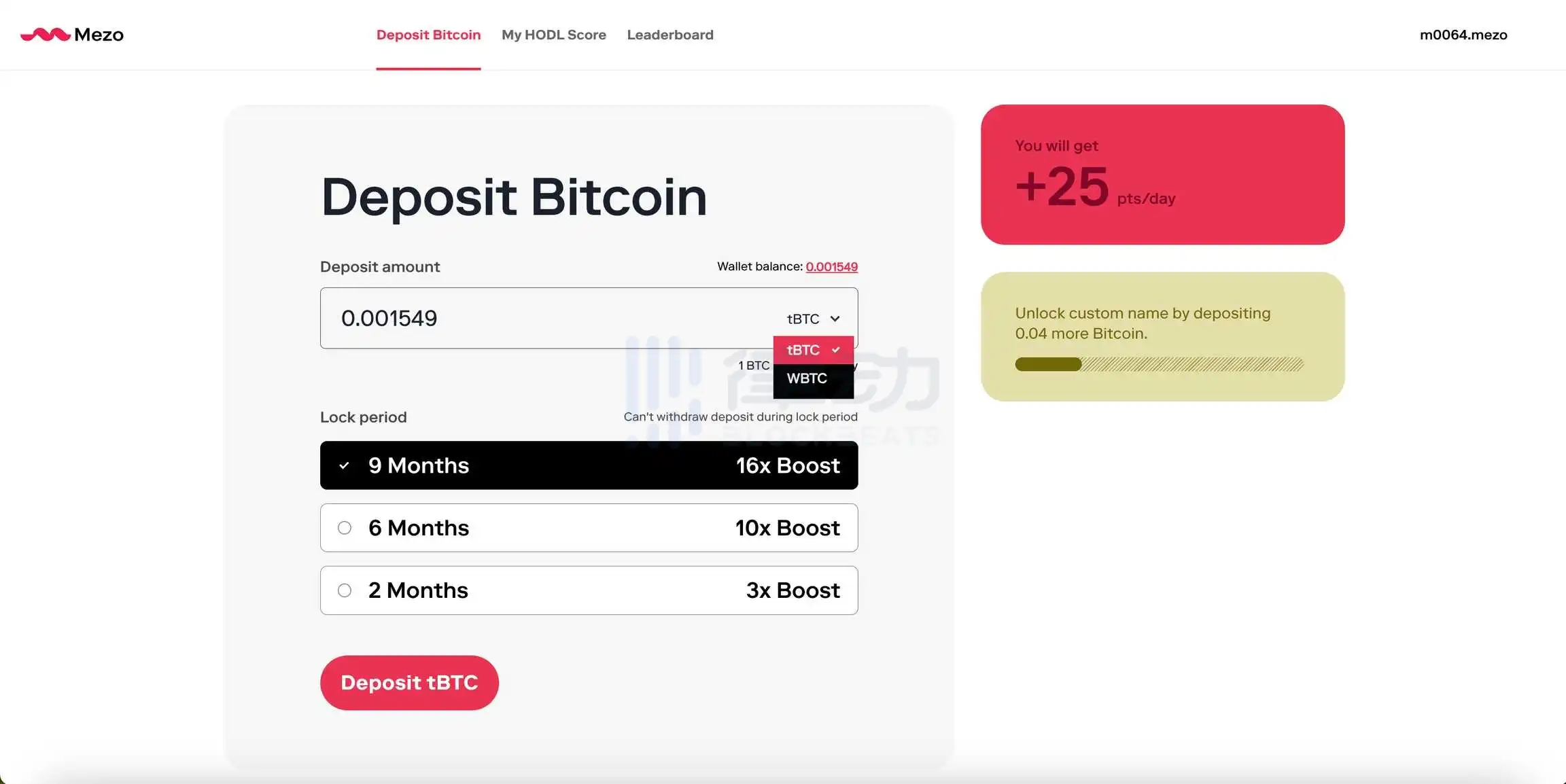 用户可以在 Mezo 上锁定 BTC 以建立 HODL Score,它是根据用户在 Mezo 上的比特币存款情况和邀请新用户参与 HODL 的结果计算出相应的得分。锁定存款的时间越长,分数就越高。同时,除了锁定 BTC 外,用户还可以锁定 MEZO 代币并通过 CometBFT 共识验证交易来保护网络。