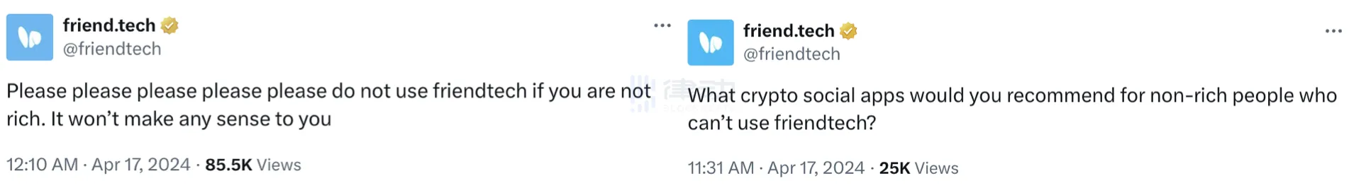 4月16日至17日,Friend.tech 官推连发数条推文,惊到了社区用户,这些推文内容大意均为「Friend.tech 的用户都是有钱人,没钱的人不要和 Friend.tech 沾边」。