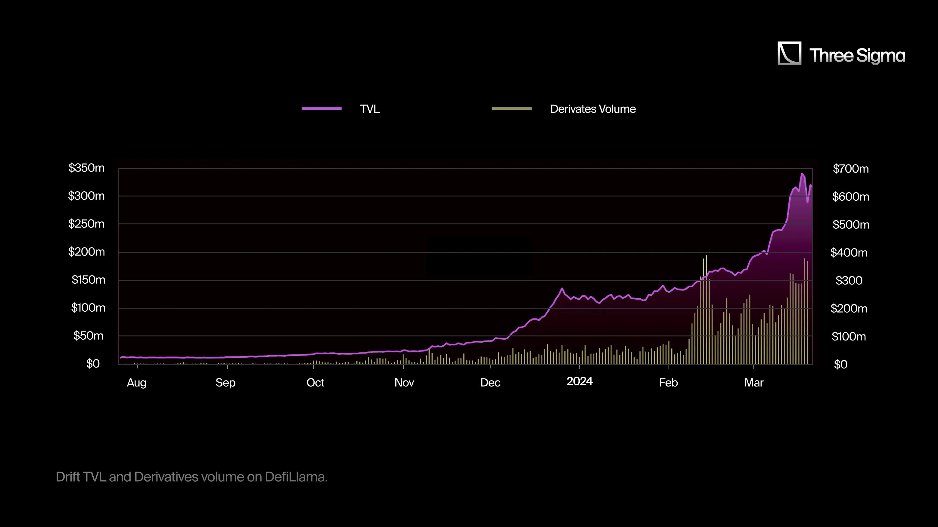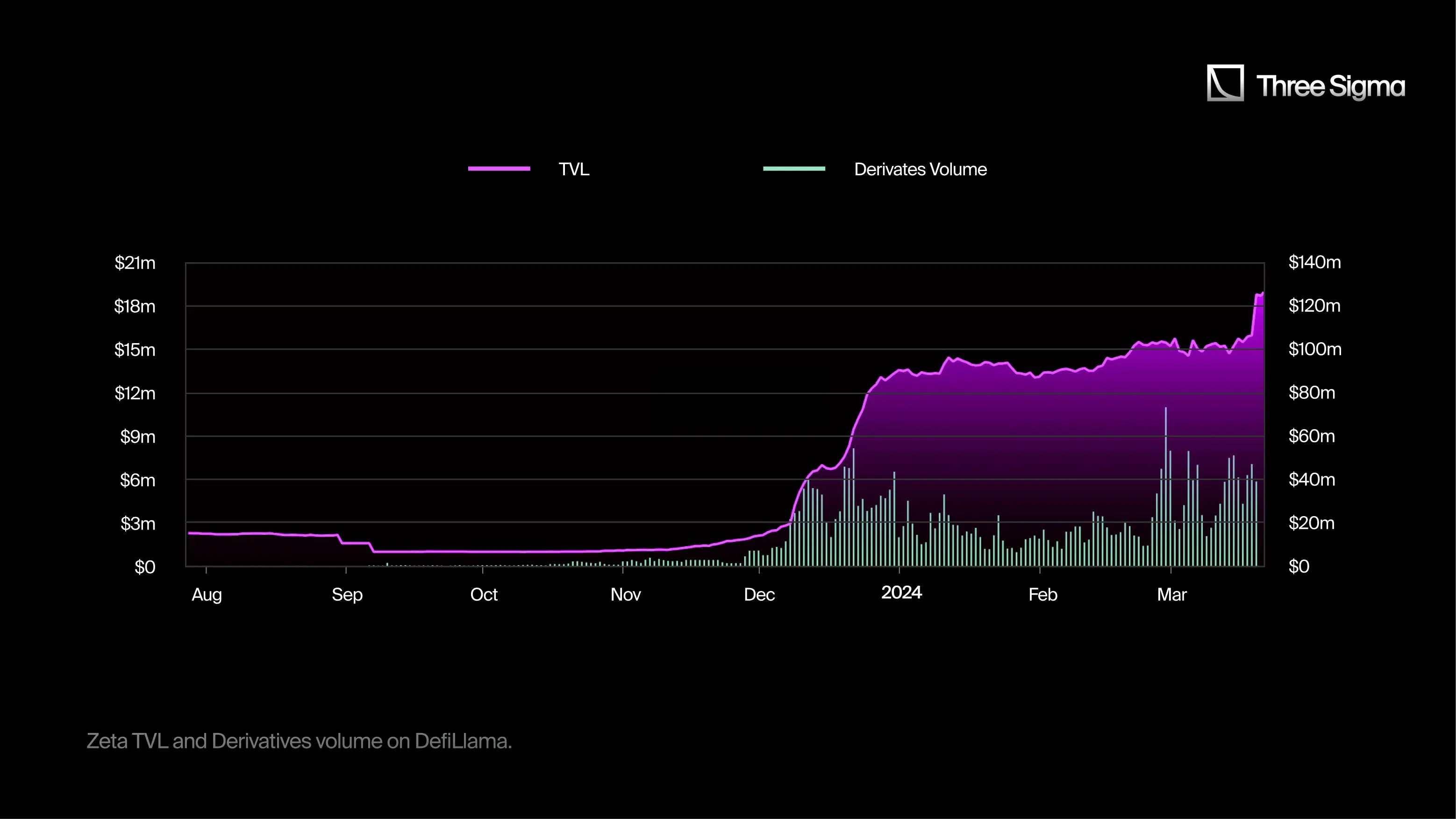 Zeta的TVL最初经历了渐增长,从10月初的近100万美元开始,到11月初的280万美元,到12月7日达到650万美元。随后,TVL急剧上涨,在不到一周的时间里翻了一番,到12月13日达到了1300万美元。之后又有一次快速增长,TVL在12月31日飙升了100%,达到了1.33亿美元。在接下来的一年初,TVL保持相对稳定,介于1300万美元和1400万美元之间。相应地,在TVL加速增长期间,交易量激增。12月7日后的激增可能归因于JTO的市场首次亮相。此时,Zeta已经启动了其第一个季度的积分计划,使自己能够吸引那些在Solana生态系统中寻求类似机会的用户。总的来说,在这次上涨中,TVL大约增加了417%,从大约300万美元增加到了约1550万美元。有趣的是,3月20日出现了明显的TVL激增,很可能是由于当天引入了推荐系统。