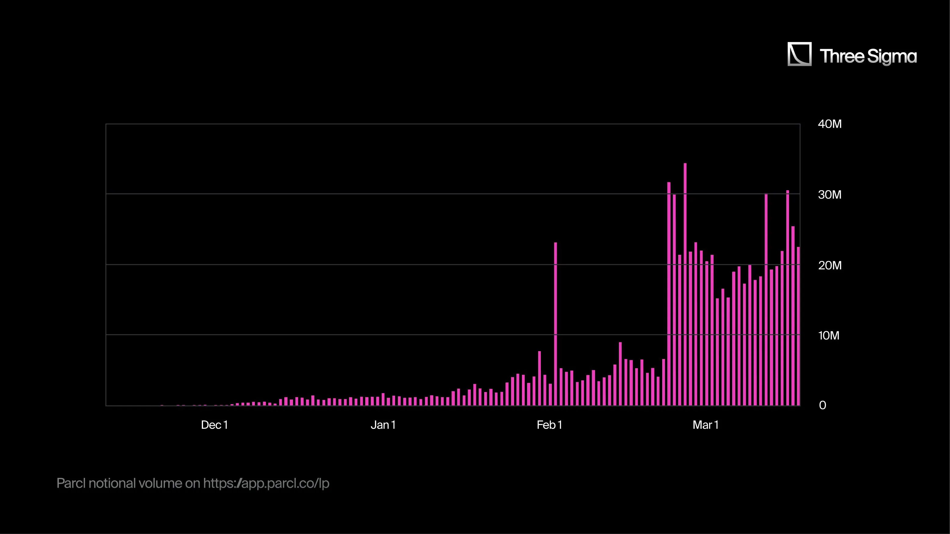 Parcl是一个独特的项目,为其用户提供房地产价格交易。DefiLlama的TVL描述中似乎存在错误,有些周数没有得到正确计算。尽管如此,在考虑到下面的Parcl名义交易量时,可以清楚地看出该项目如何从这里提到的其他协议中观察到的类似增长动态中受益。虽然用户已经因其活动而获得了积分,但积分的全面展示宣布于12月15日开始生效。自那时起,交易量稳步增加,活动也有显著的波动。尤其引人注目的是从2月25日的660万美元激增到第二天的3150万美元,与Aevo宣布PARCL预售期货同时发生。