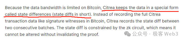采用第一种思路的 Layer2 中,最出名的可能是 Citrea,它们打算把一段时间内 Layer2 的状态变化 (state diff),也就是多个账户上的状态变更结果,连同对应的 ZK 证明,一起上传到比特币链上。这种情况下,任何人都可以从比特币主网下载 state diff 和 ZKP,进而监测到 Citrea 状态的变化结果。这种方法可以把上链的数据尺寸压缩 90% 以上。