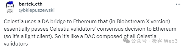 Celestia 此前提出的 BlobStream,本质是用 Celestia 替代中心化的 DAC,以太坊 L2 的排序器可以把 DA 数据发布到 Celestia 链上,如果有 2/3 的 Celestia 节点为之签名,以太坊上部署的 Layer2 专属合约就认为排序器如实发布了 DA 数据,这实际是让 Celestia 节点作为担保人。考虑到 Celestia 有上百号 Validator 节点,我们可以认为这个大号 DAC 是比较去中心化的。