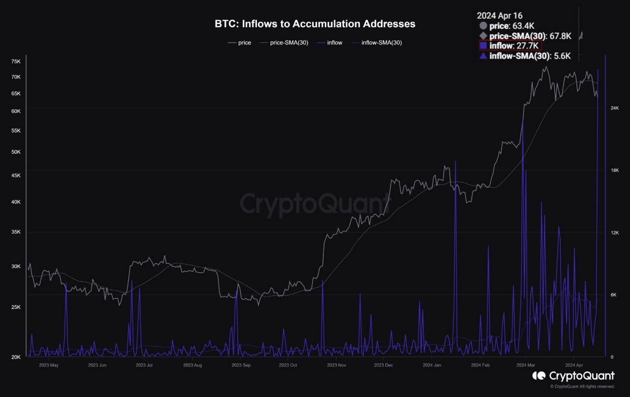 根据CryptoQuant的最新数据,在4月16日至17日的24小时内,超过27700个BTC(按当前价格计算价值17.5亿美元)被发送到了累积地址,创下了比特币的单日新纪录。此前的记录是今年3月23日,当时比特币的价格也徘徊在63500美元左右。