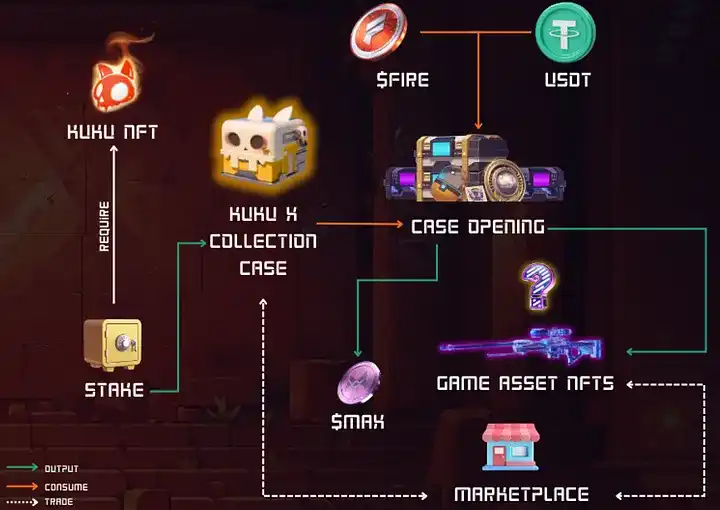 1)质押 KUKU NFT 积累忠诚度,获得 KUKU 宝箱,忠诚度增益宝箱越多 2)KUKU 宝箱开启: FIRE+少量币稳定 3)KUKU 宝箱收益 1:顶级壁纸 NFT 资产,绝版 4)KUKU 宝箱收益 2:获得最早期的 MAX 代币奖励,开出的 NFT 价值增益,获得的 MAX 代币的加成增益 5)资产合成:低阶皮肤资产*10,合成更高一级皮肤资产