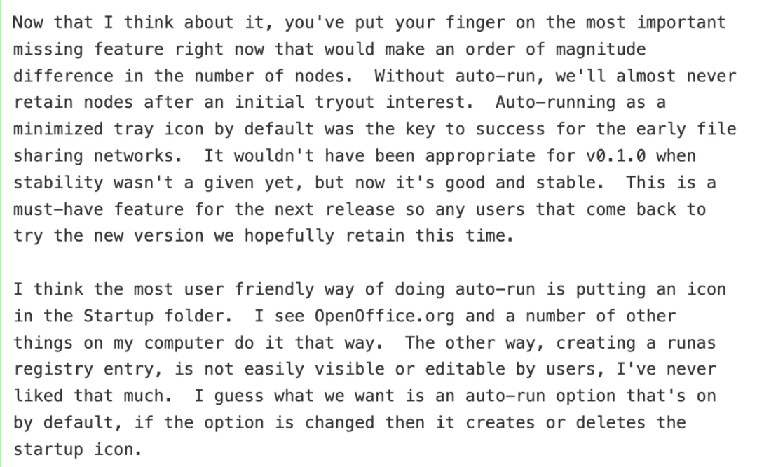 回想起来,你确实指出了一个当前极为关键的缺失功能,这个功能有潜力极大地增加节点数。如果没有自动启动,我们很难在用户初次尝试后留住他们。正如早期文件共享网络成功的秘诀,让程序自动运行并默认隐藏至系统托盘至关重要。虽然在我们的第一个版本(v0.1.0)时,由于稳定性尚未得到保证,引入这一功能似乎不太恰当。但现在,随着程序已经变得足够稳定,这一功能成为了我们下一版必须添加的特性,以确保那些愿意尝试新版本的用户能有更好的体验并且愿意继续使用。」