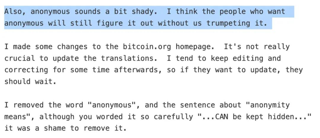 原文翻译:「“匿名”这个词听起来有点可疑。我认为那些想要匿名的人还是能自己弄明白,无需我们大肆宣扬。我对 bitcoin.org 首页做了一些修改。更新翻译并不真的紧急。我倾向于在之后一段时间内继续编辑和修正,所以如果他们想更新,最好等等。」