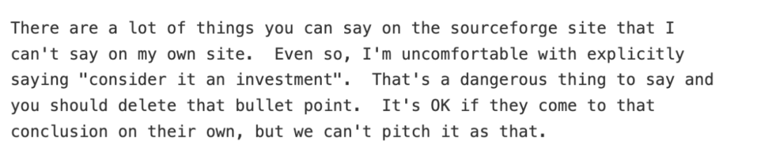 「在 sourceforge的 网站上,你能发表很多在我自己的网站上不能说的观点。然而,直白地提出『将比特币视为一种投资』这一点,我还是感到有些不妥。这种说法颇有风险,你最好去掉这一观点。如果用户自己有这样的想法当然无妨,但我们不能将其作为一个卖点来宣传。」