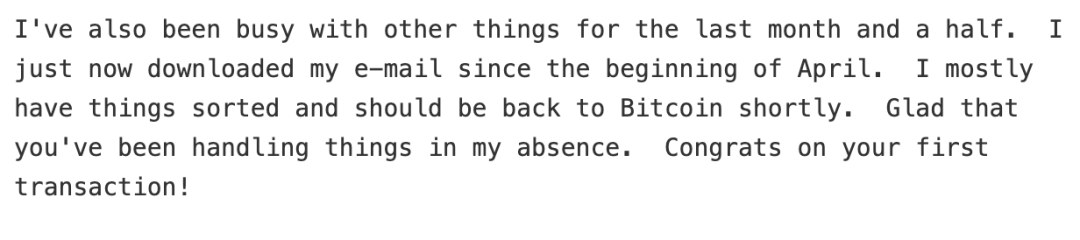 老板中本聪突然消失一个月,还是 Martti 扛下了论坛运营。原文翻译:「过去一个半月我也忙于其他事务。我刚刚从四月初开始下载我的电子邮件。我大部分事情都处理好了,应该很快会回到比特币的工作中。很高兴看到你在我不在的时候处理了一些事情。祝贺你完成了你的第一笔比特币交易!」