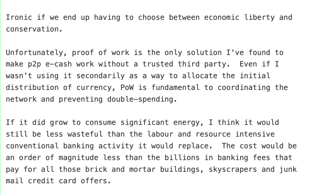 中本聪也预见到了如果比特币进入主流,一定会使用大量的能源。这或许在当时是很「炸裂」的观点:银行系统,比 PoW 更浪费资源。