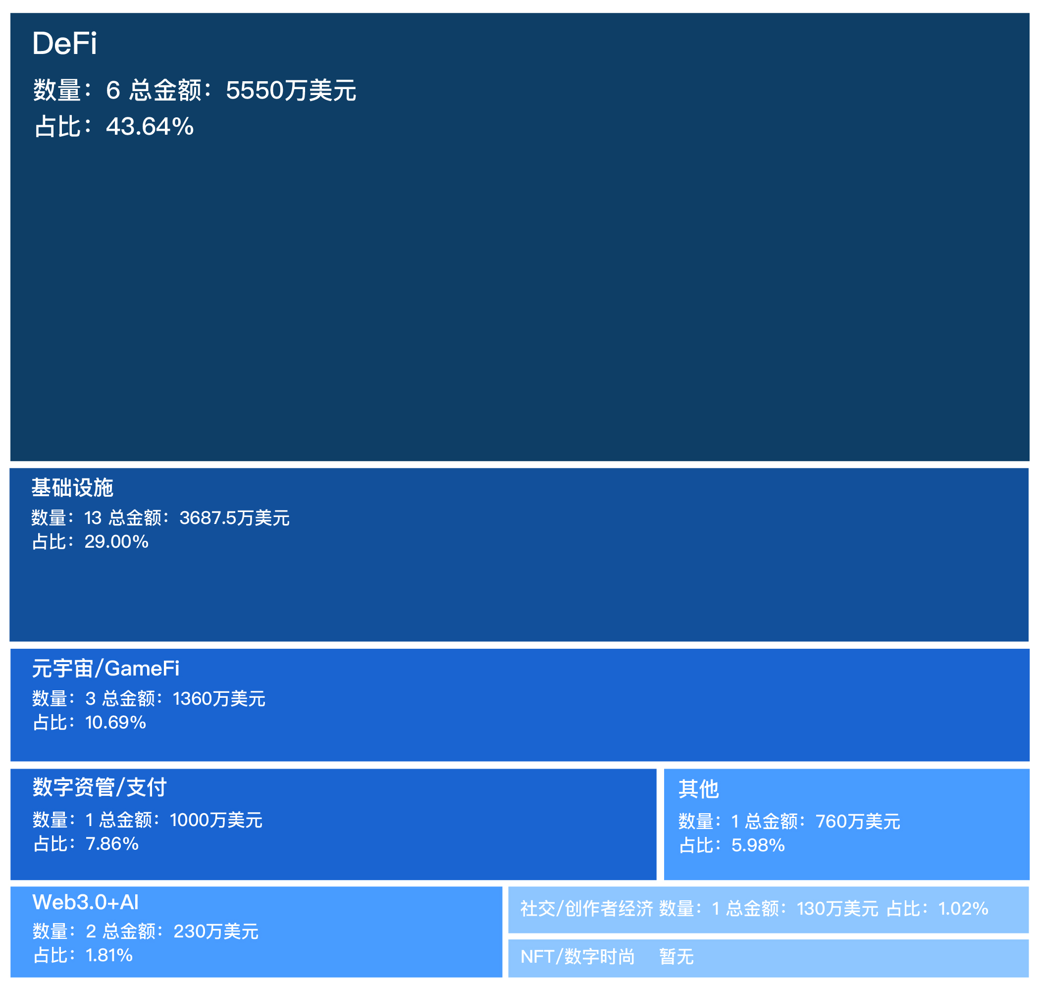据 统计,上周的融资总数为 27 笔,数量较之前增多,总金额约为 12717.5 万美元,平均融资金额为 471.02 万美元。其中 DeFi 占据主体,基础设施和元宇宙板块融资相对较多,数字资管/支付领域和其他领域融资增多,Web3.0+AI 领域和社交/创作者经济领域较少,NFT/数字时尚领域暂无。下图为上周各板块融资占比: