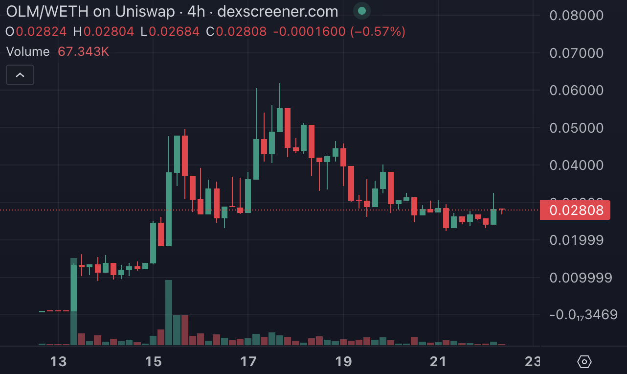 该次进行 IMO 的模型是 ORA 推出的 OpenLM 开源模型,IMO 完成后,代币$OLM 最大涨幅超 50 倍,但近几日已经据高点回撤 50%。
