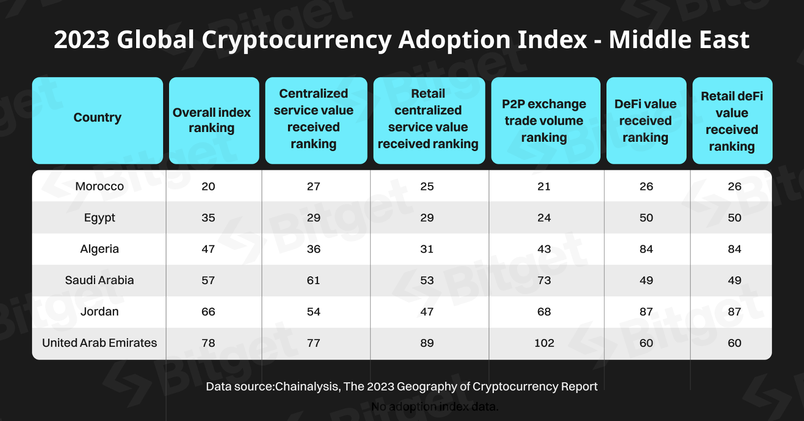 从加密货币的总体量和接受程度来看,中东在全世界范围内的数据表现并不突出,中东和北非在2023年收到的加密货币总量加在一起约占全球的7.2%。但因其开放的政策和飞速的发展,依然是加密世界中极其重要的组成部分。根据Chainalysis 2023年的Adoption Index数据排名,摩洛哥、埃及、阿尔及利亚、沙特阿拉伯、约旦、阿联酋分别排在第20、35 、47 、57 、66 、78 名。
