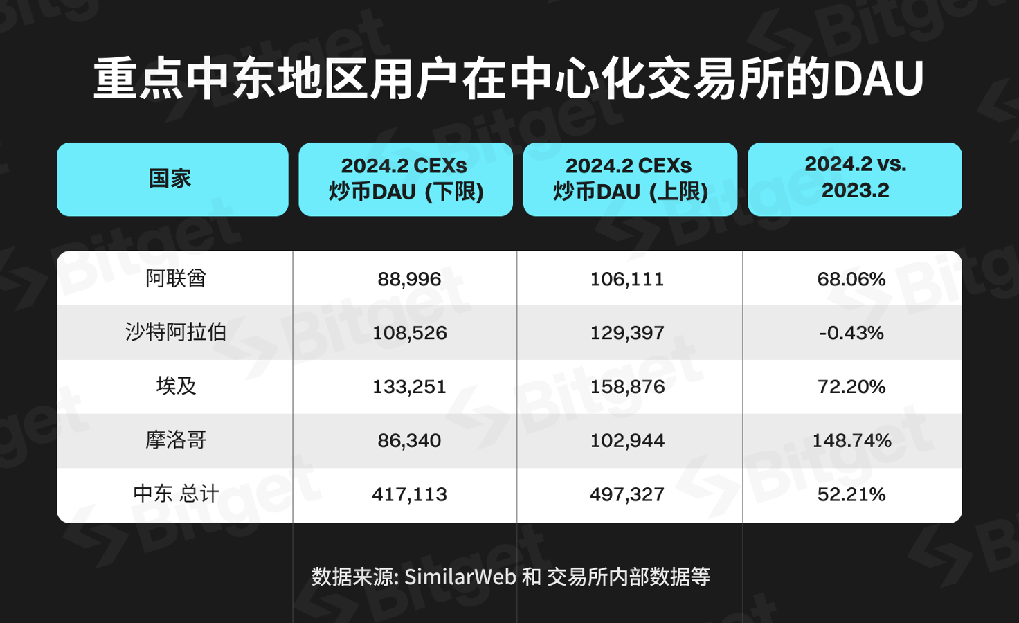 2023年2月,整个中东地区在中心化加密货币交易所的炒币DAU 约为 33万 人。随着BTC Spot ETF通过、加密货币市场总市值持续攀升,到2024年2月,中东地区在中心化加密货币交易所的炒币DAU 达到约 50万 人。