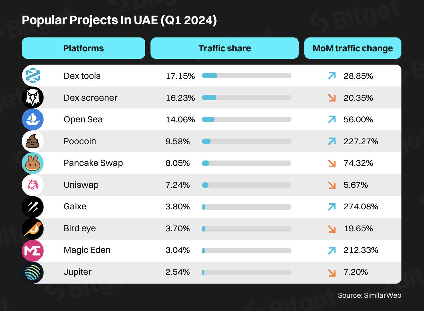 【阿联酋】:阿联酋用户主要参与的项目和板块是DEX,Web3任务平台和NFT交易平台。其中主流的代币行情网站dextool、dexscreener、poocoin、birdeye等较为热门;DEX交易平台pancakeswap和uniswap较为收到阿联酋用户喜爱;NFT方面Opensea和magiceden热度较高;Web3任务平台galxe热度较高。