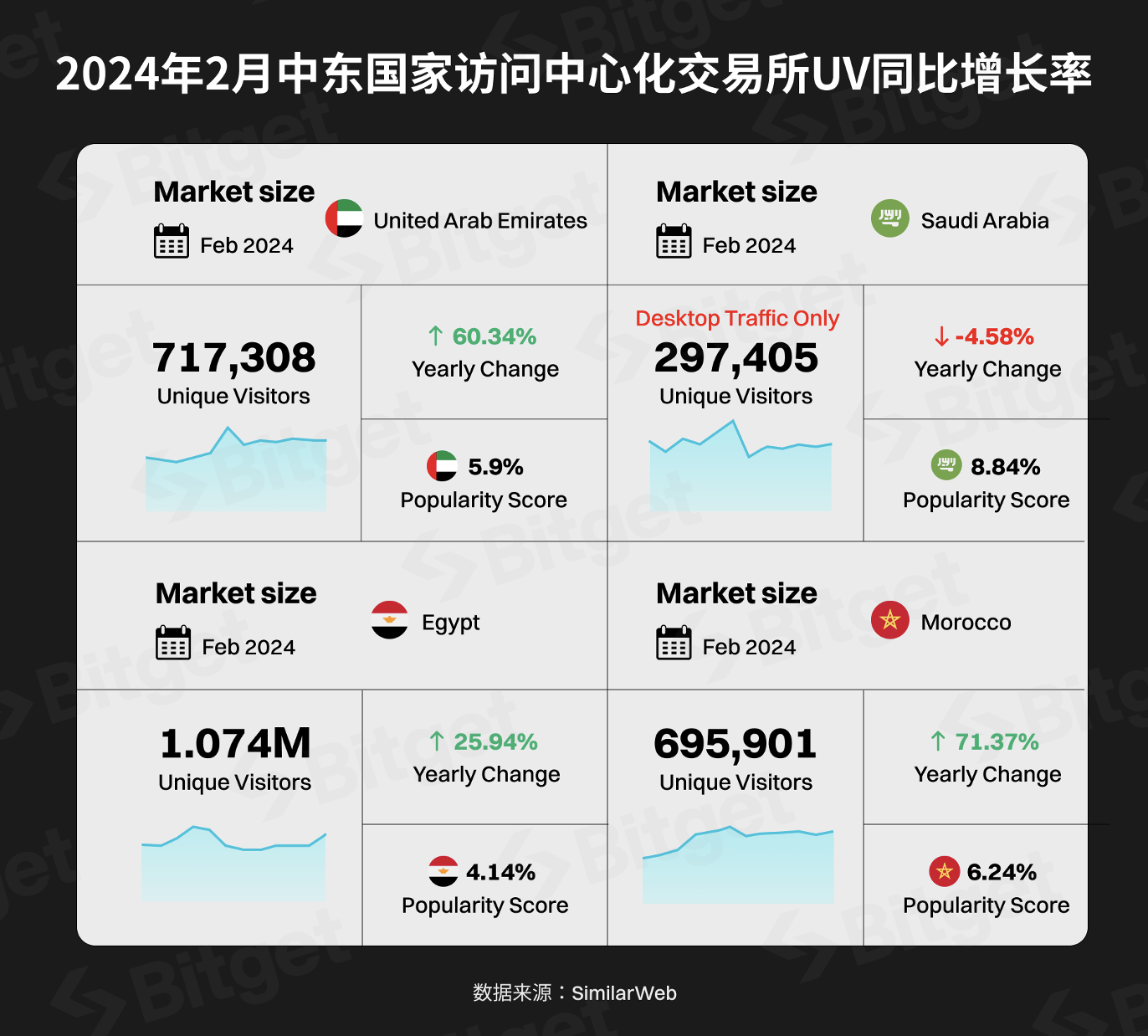 整体而言,在过去一年中,中东国家对中心化交易所的访问量呈明显上升趋势。阿联酋和摩洛哥的User Visits(UV) 数据分别达到了60%和71%,埃及的数据同比增长25%;而沙特的流量出现小幅下滑,可能与其用户体量最速增长周期比其他国家更靠前有关。(前文提到,多个信息源显示,沙特是2022到2023年加密货币交易同比增长最高的国家)