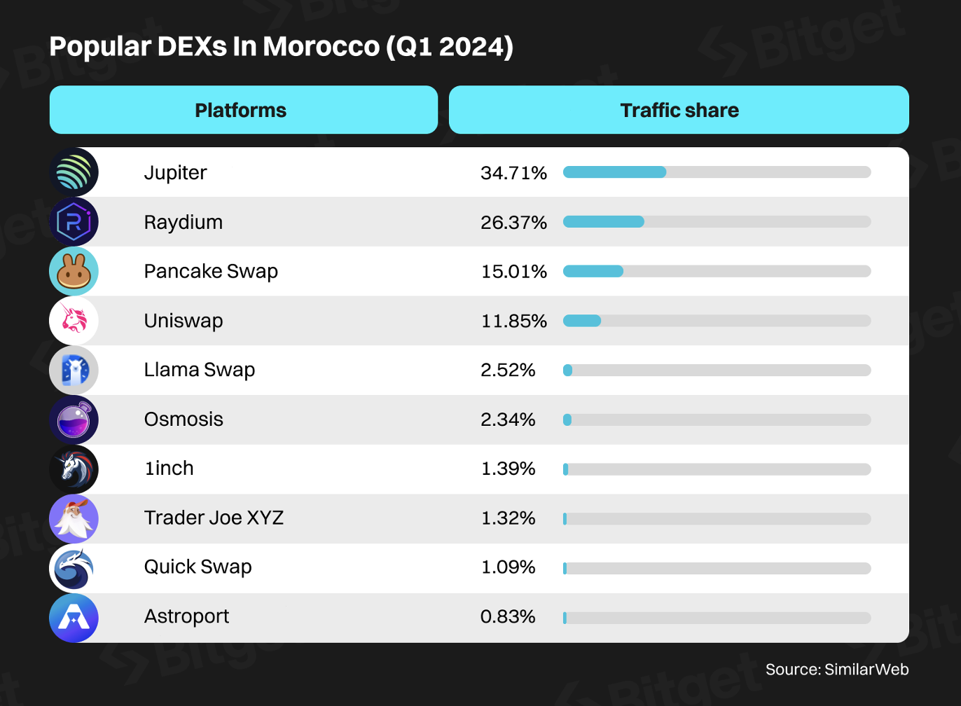 埃及和摩洛哥用户在交易喜好上相差较大,埃及用户偏向于使用pancakeswap,而摩洛哥用户偏向于使用jupiter。其余公链的均是头部去中心化交易所表现较为突出。值得注意的是,埃及用户使用astroport的比例更高,说明用户更关注cosmos生态项目。而摩洛哥用户的交易兴趣主要集中于Solana链。