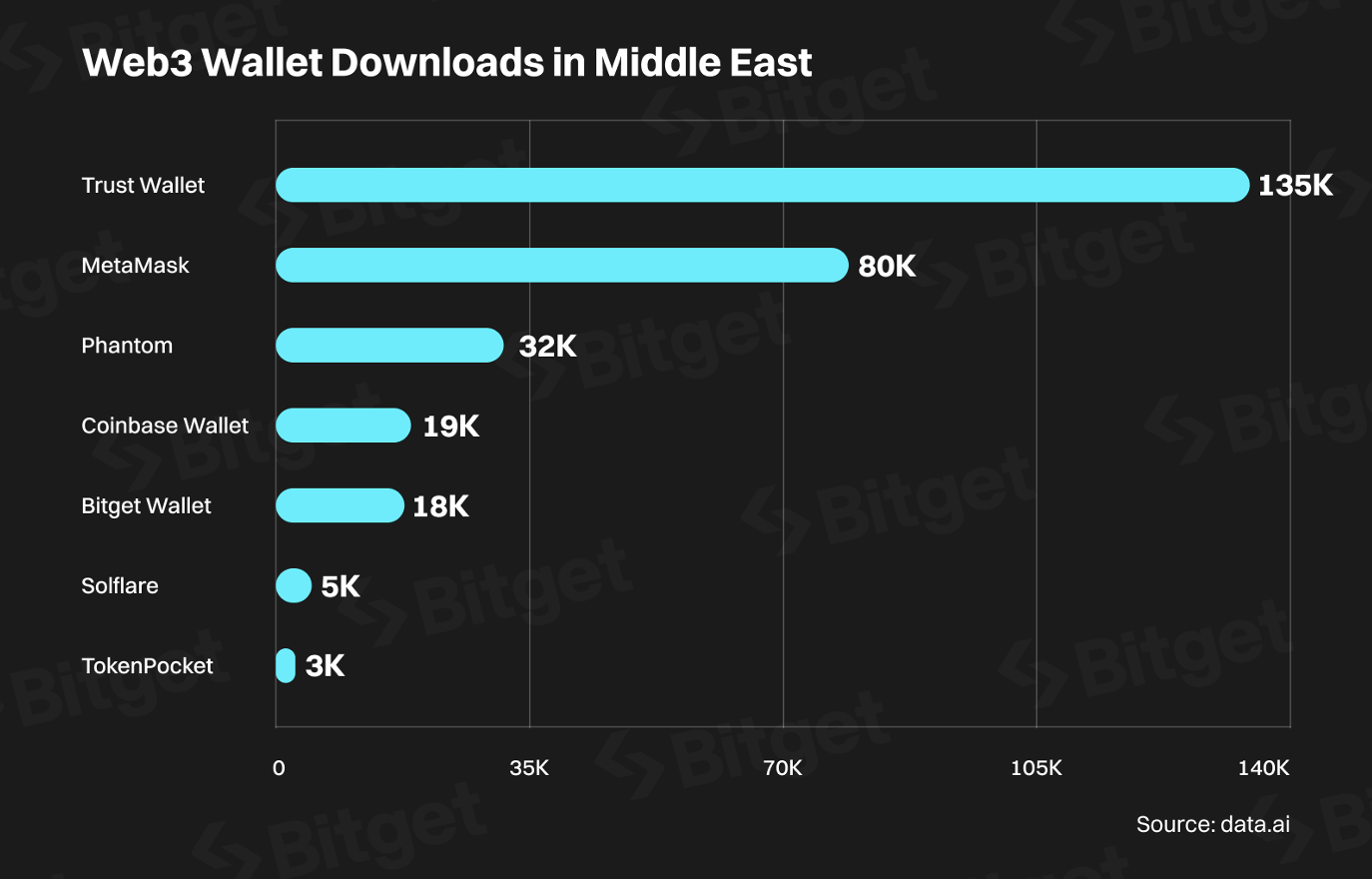 在钱包使用方面,Trust Wallet、MetaMask、Phantom、Coinbase Wallet、Bitget Wallet是中东地区Top5的钱包。