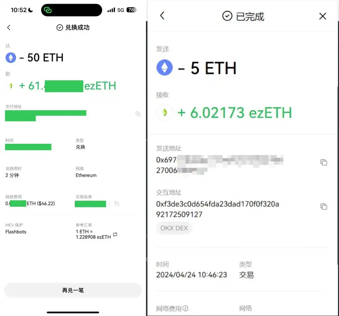 大幅脱锚的时间很短,不过不少人却借此机会抄底成功。据链上分析师 @ai_9684xtpa 监测,某鲸鱼在 ezETH 脱锚期间使用 2400 枚 ETH 买入 2499 ezETH,价值 698 万美元,净赚 99 枚 ETH。