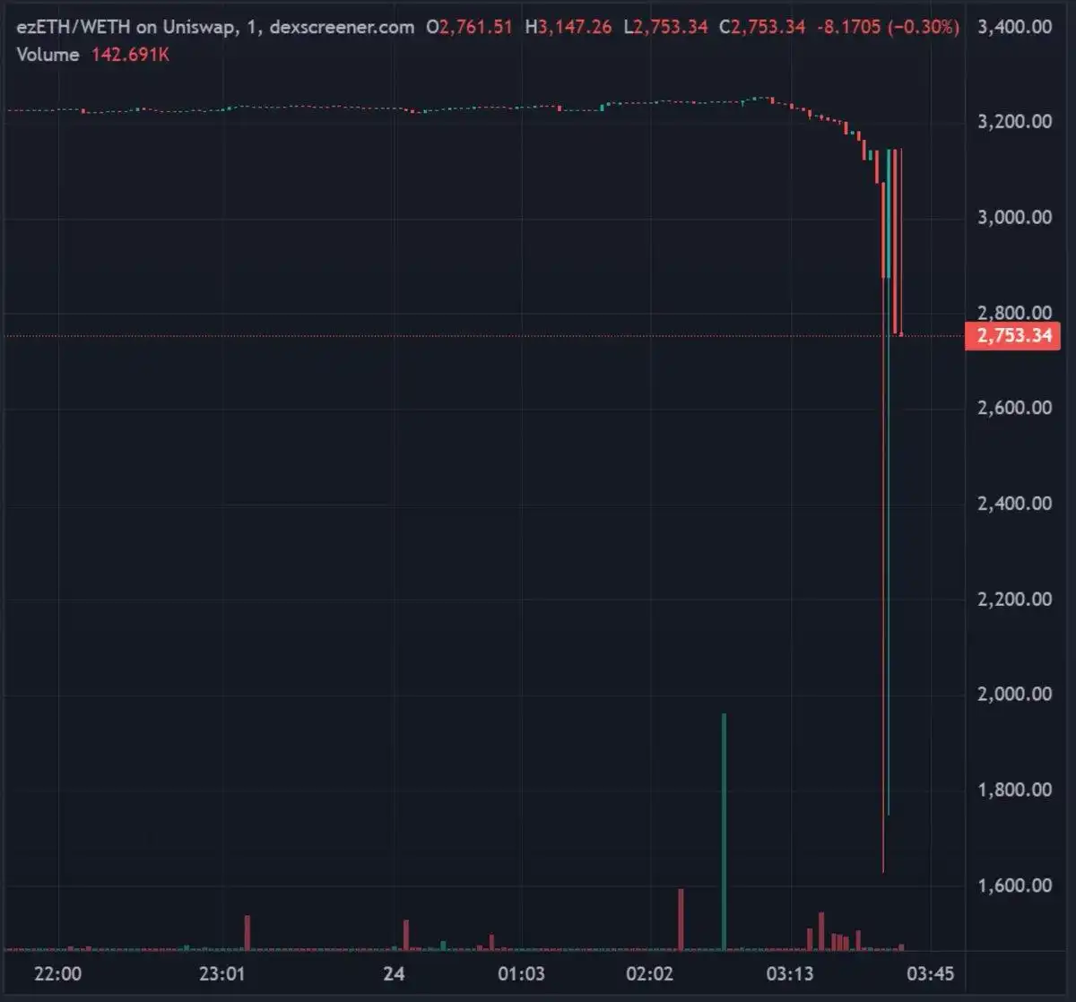 也许上述观点并非完全中肯,不过社区的不满情绪确实存在。再加上 ezETH 代币在 Uniswap 上的流动性池子深度较低,ezETH 价格刚刚出现大幅脱锚,一度出现插针,跌幅高达 50%,大约 1600 美元。