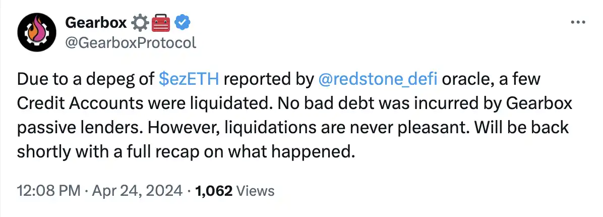 在脱锚期间,某鲸鱼在 ezETH 脱锚期间使用 2400 枚 ETH 买入 2499ezETH,价值 698 万美元,净赚 99 枚 ETH。这次脱锚事件也让社区意识到 LRT 存在的风险,DeFi 可组合型杠杆协议 Gearbox 表示由于 ezETH 脱锚导致部分用户被清算。