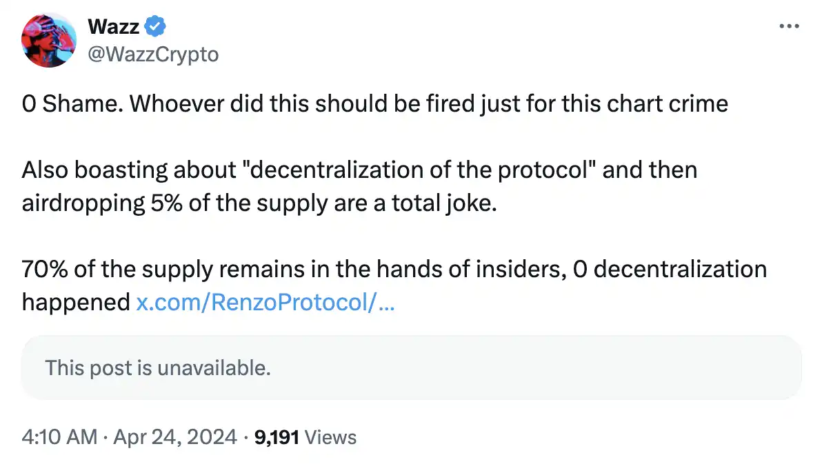 随后,Renzo 官方删除了该条公告,但还未更新新的代币分配。但让市场更为愤懑的一点是,Renzo 的代币分配也并不让人满意。加密 KOL@WazzCrypto就转发原公告称「还吹嘘「协议去中心化」,只空投 5%,这完全是一个笑话,70% 的供应仍然掌握在内部人士手中。」