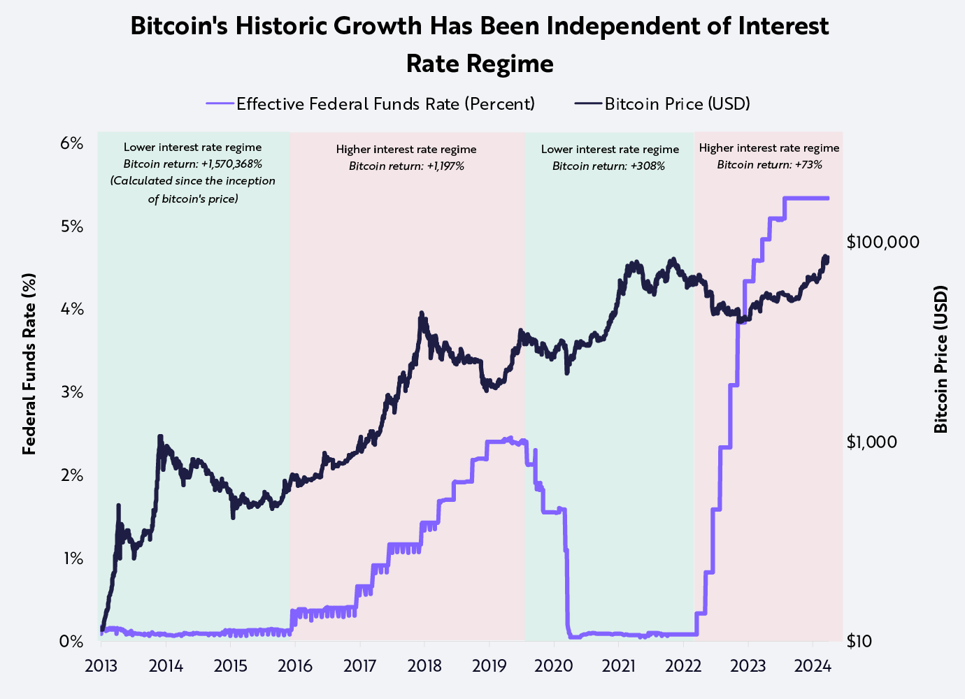 此外,将比特币的价格与联邦基金利率进行比较,可以看出其在不同利率和经济环境中的弹性,如下所示。重要的是,无论是在高利率还是低利率制度下,比特币的价格都大幅上涨,如下所示。